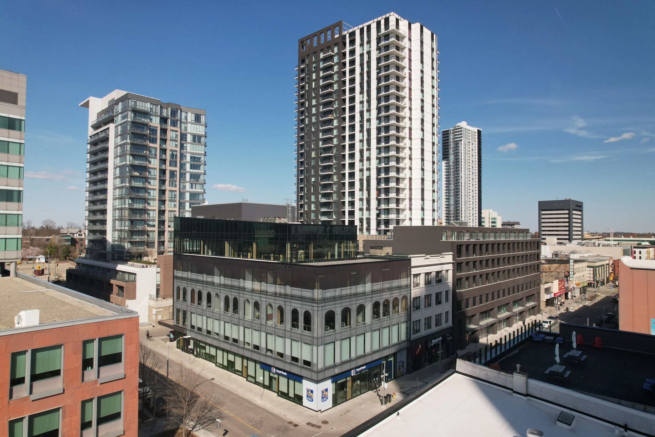 6.5-storey construction with Canadian wood turned into glulam columns and nail laminated timber (NLT) panels. One Young Street is the first new Mass Timber building in Waterloo Region.